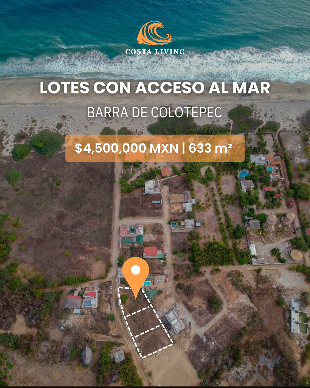 Oportunidad de inversión en La Barra de Colotepec: tres lotes de 633 m² cada uno, ubicados a solo 200 metros del mar y a 5 minutos de la carretera 200. Una zona con gran plusvalía, perfecta para proyectos de casas vacacionales o departamentos.
